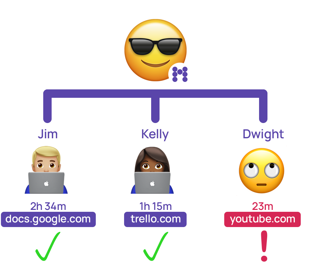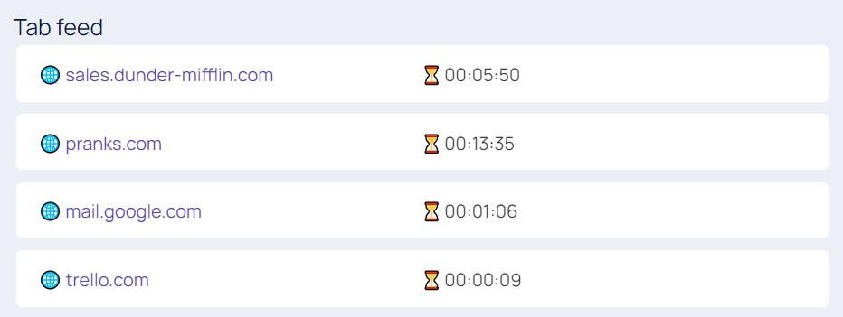 Descriptive tab feed that reveals every website your manager visits during a day with time spent on it.